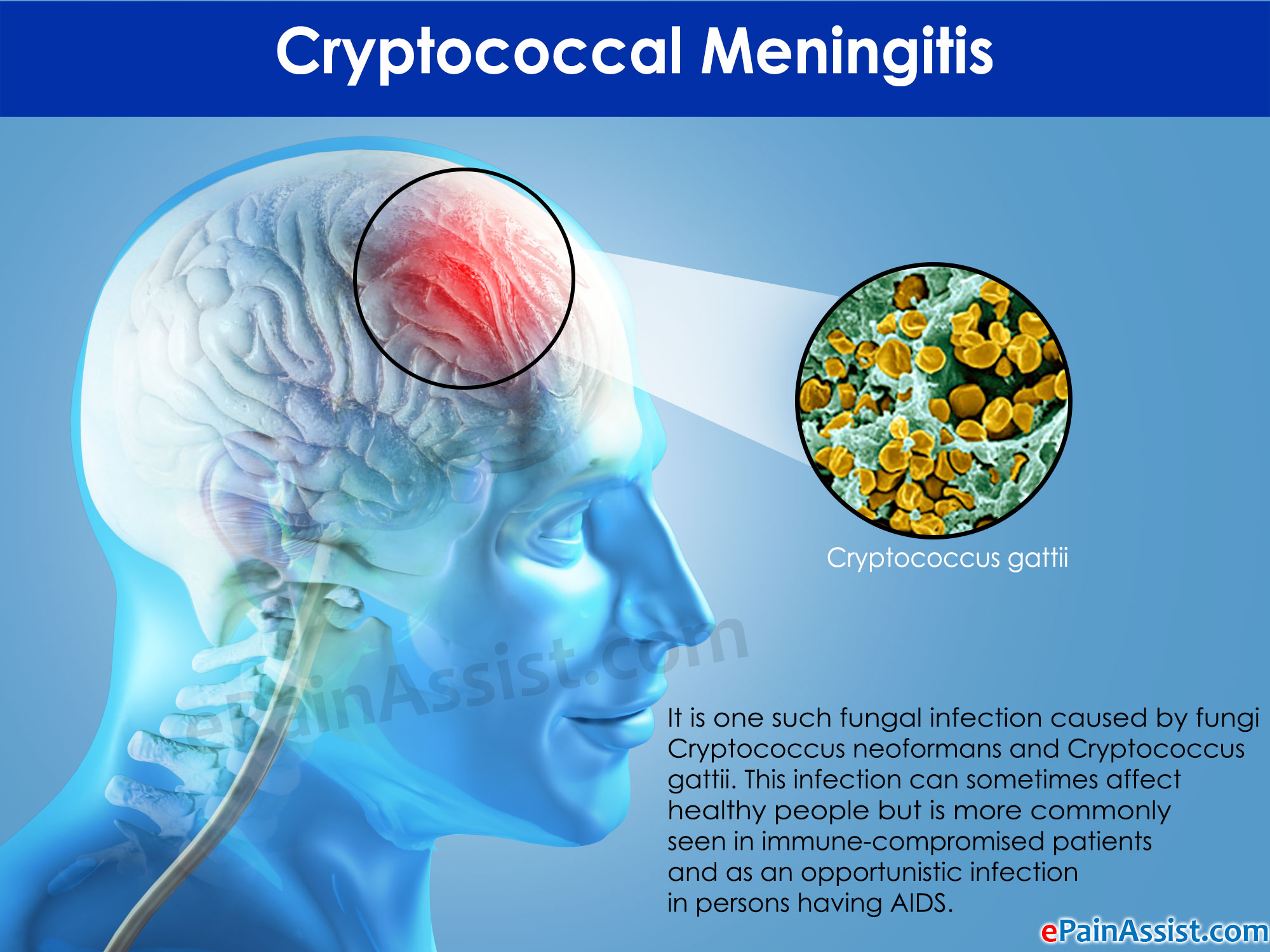 Cryptococcosis or Cryptococcal meningitis is caused when the fungal infection from the lungs spreads to the brain. Cryptococcal meningitis is not contagious and does not spread from person to person. The fungal infection spreads from some other part of the body through bloodstream, direct introduction into the bloodstream or when a site near the central nervous system gets infected.