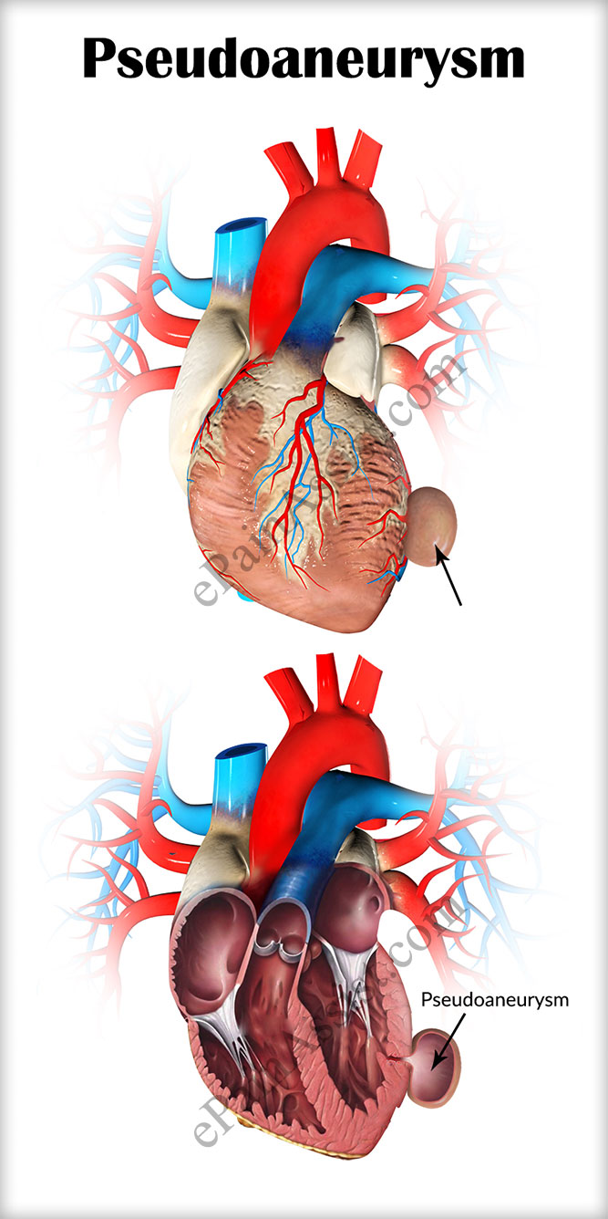 There have also been cases of Pseudoaneurysm occurring in the chambers of the heart as well usually the left ventricle usually due to damage caused by a heart attack to the chambers of the heart which causes blood to pool outside the heart muscle which has been injured damage from a heart attack causes blood to leak and pool outside the injured heart muscle.