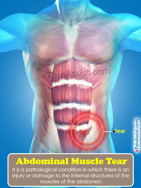 An Abdominal Muscle Tear Which is also known as Abdominal Muscle Strain is a pathological condition in which there is an injury or damage to the internal structures of the muscles of the abdomen. A strain can be described as a partial or complete tear of a muscle. In majority of the cases, the strains or tears are very minute and may lead to some kind of discomfort in the affected area but in some cases there is a complete tear where the muscles pull away from each other then it that case it is called as a muscle rupture, in this case the Abdominal Muscle Rupture. The abdominal muscles are situated around the abdomen and the trunk and form the core muscles of the body.