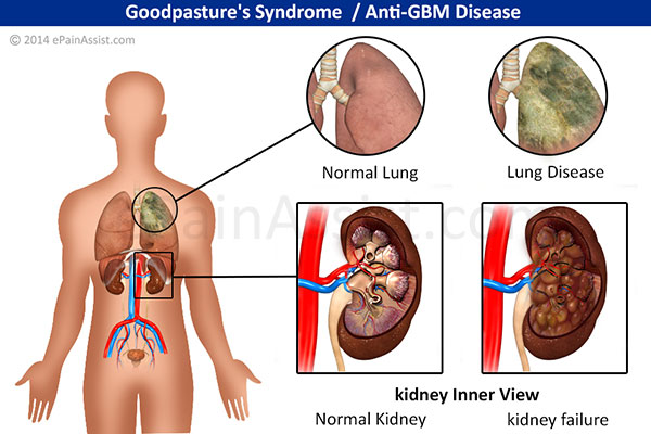 In some cases inspiration of hydrocarbon solvents while breathing and viral infections of respiratory system may also result in Goodpasture syndrome. This occurs when immune system of body mistakenly attacks tissues or organs assuming them to be foreign chemicals and viruses.