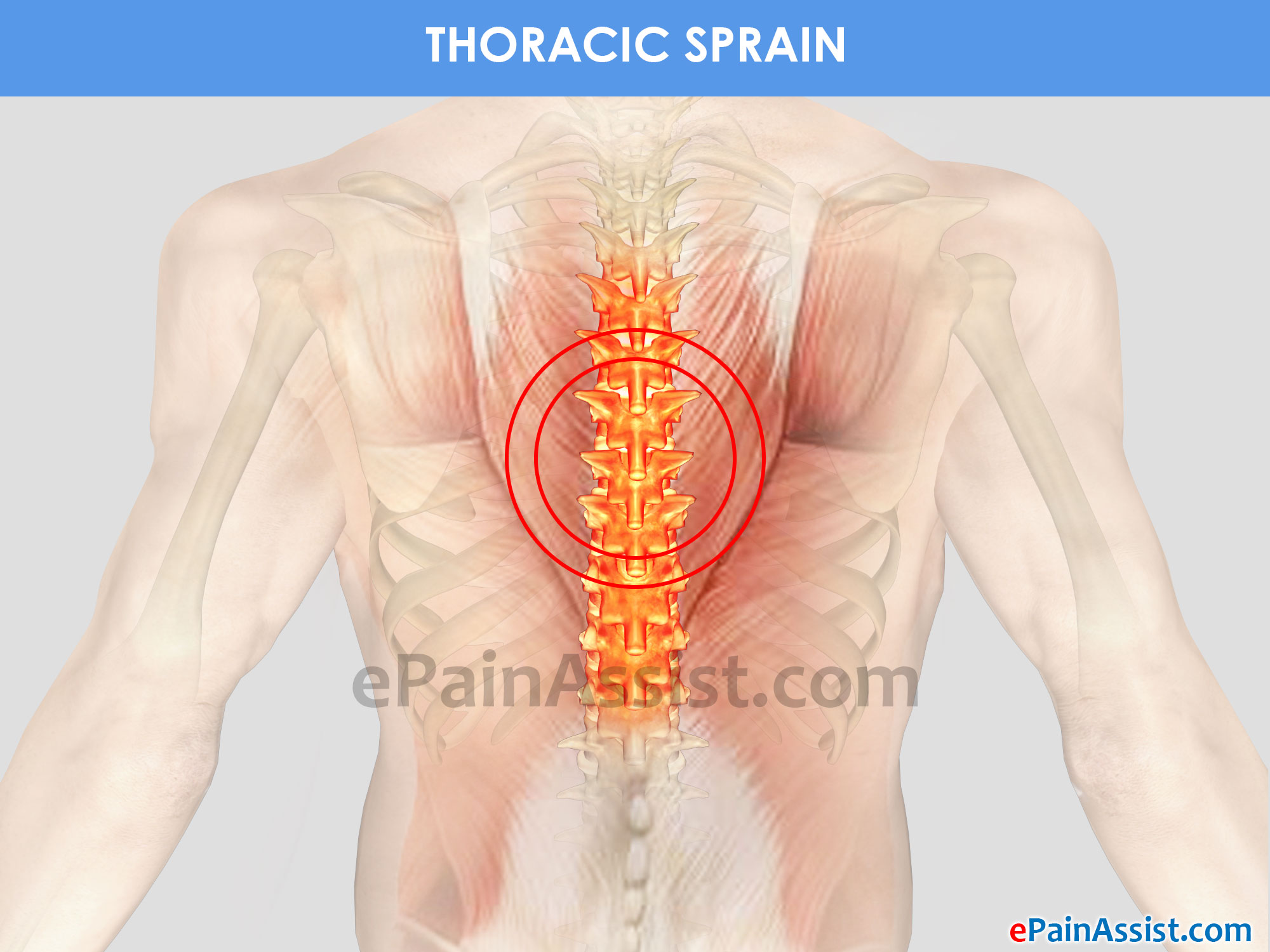 Sudden onset back pain with activities is the primary symptom of a Thoracic Sprain. Depending on how severe the injury is the symptoms vary and can range from mild pain to excruciating pain in the thoracic region. Some of the symptoms of Thoracic Sprain are: