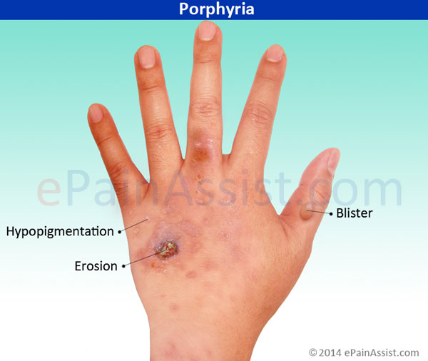 Porphyria is a rare disease caused by excessive porphyrins secretion, which deposits in the body. Porphyria is caused by genetic mutation resulting in malfunction of enzyme, which metabolizes the porphyrin and heme. Porphyrins are normally found in body in lesser quantity. Accumulation and tissue build up of porphyrin causes chronic diseases, mostly affecting skin and nervous system. The signs and symptom of porphyria involves either nervous tissue or skin. Porphyria is an inheritance disease often triggered by environmental factors. Treatment is dependent on type of porphyria. There is no cure for porphyria, but symptoms are controlled by alternative and allopathic therapies. Symptoms are tolerable with changes in lifestyle and avoiding factors, which triggers clinical manifestation.