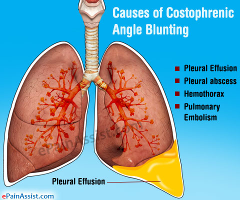 - Pleural Effusion- Collection of fluid outside lung between lung and chest wall. Costophrenic Angle Blunting is seen more often in individuals with Pleural Effusion. Pleural effusion is the accumulation of fluid in space surrounding the lungs, which can be due to some type of infection of the lungs.