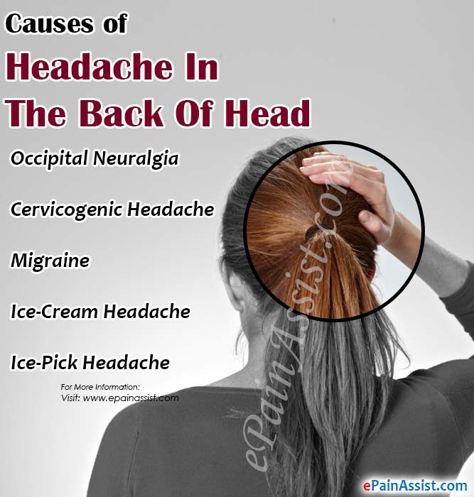 Some patients experience cluster pains in the back of the head which can also be accompanied with neck pain. The exact cause of this type of headache in the back of the head is not clear. In case of acute attacks, Sumatriptan injections and oxygen are effective. Verapamil helps in preventing this type of headache.