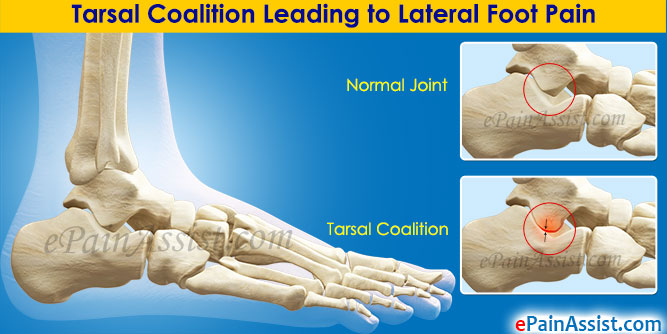 The tarsal coalition leads to foot pain on the outer side only in one in a hundred cases. The Tarsal Coalition is a condition caused by the fusion of the two tarsal bone at the back of the foot on the lateral side. The tarsal bone involved is cuboid, cuneiform, and navicular bone. Though it is one of the rare conditions leading to lateral foot pain, it would be fair enough to be included under this list. It is a congenital problem and symptoms may include pain, fatigue, flat feet, and abnormal or improper walking.