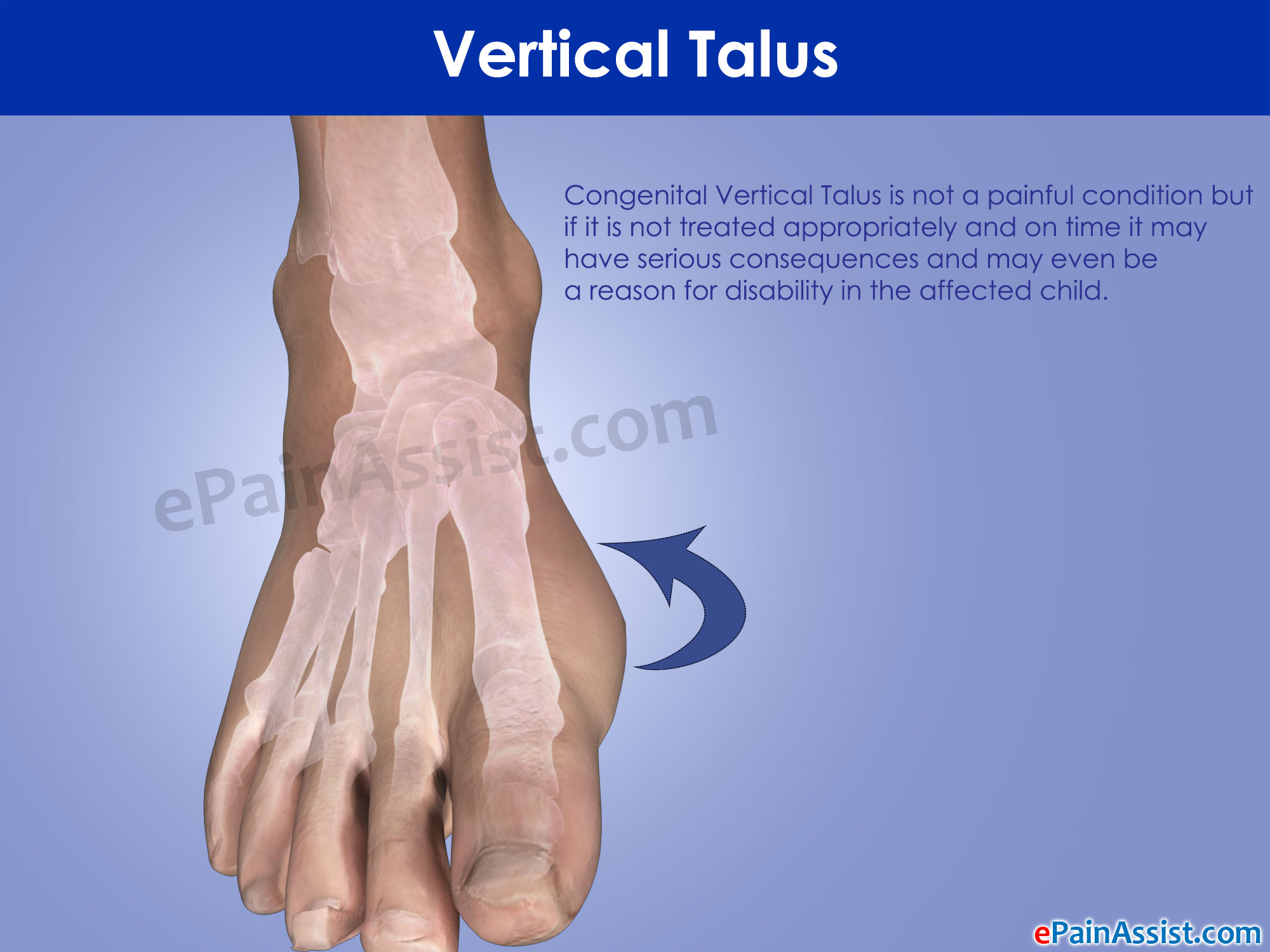 When studying about foot deformities one comes across a congenital foot deformity called as Congenital Vertical Talus. This condition is one of the causes of flatfeet in children. This condition can affect one or both feet. Congenital Vertical Talus is not a painful condition but if it is not treated appropriately and on time it may have serious consequences and may even be a reason for disability in the affected child. To understand Congenital Vertical Talus, it is important to understand the anatomy of the foot. The talus is a very small bone, which is situated between the calcaneus and the tibia and fibula. The tibia and the fibula is situated around the side of the talus and forms the ankle joint. The talus is an important bone as it connects the foot to the leg and facilitates weight transfer across the ankle joint. Now coming to Congenital Vertical Talus, in this condition the talus bone is formed at an incorrect position resulting in other bones to shift on top of the bone. This causes the front part of the foot to point vertically. The bottom of the foot becomes stiff and curves out causing a condition called rocker bottom foot. This condition is identified immediately after birth and at times even before if an ultrasound of the fetus is conducted. This condition is quite rare and is often misinterpreted as some other foot deformity before an actual diagnosis is made.