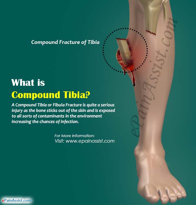 A gunshot wound to the shin or calf area may also cause a Compound Tibia or Fibula Fracture. Elderly people may also suffer from Compound Tibia or Fibula Fracture as their bones become brittle and weak with age and a simple fall on uneven surface may result in a Compound Tibia or Fibula Fracture.