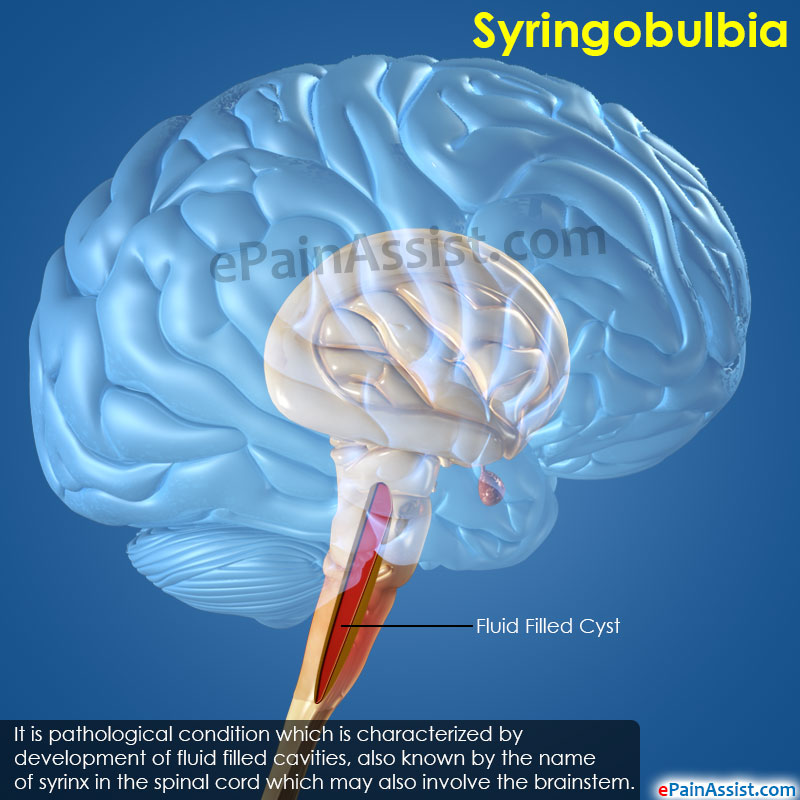 Syringobulbia is pathological condition which is characterized by development of fluid filled cavities, also known by the name of syrinx in the spinal cord which may also involve the brainstem. Normally it occurs as a very small gap in the lower part of the brainstem which affects one or more cranial nerves resulting in various symptoms to include facial palsies. Additionally, the sensory pathways may also get impaired due to this condition due to obstruction caused by the collection of the cerebrospinal fluid. Syringobulbia is almost always associated with another similar condition called Syringomyelia, but in this case the syrinx does not extend beyond the spinal cord.