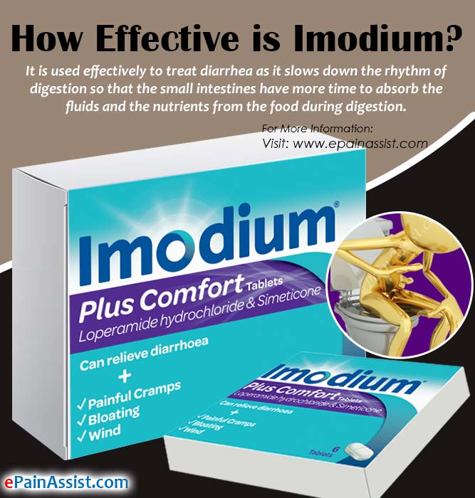 Imodium or loperamide is used effectively to treat diarrhea as it slows down the rhythm of digestion so that the small intestines have more time to absorb the fluids and the nutrients from the food during digestion.