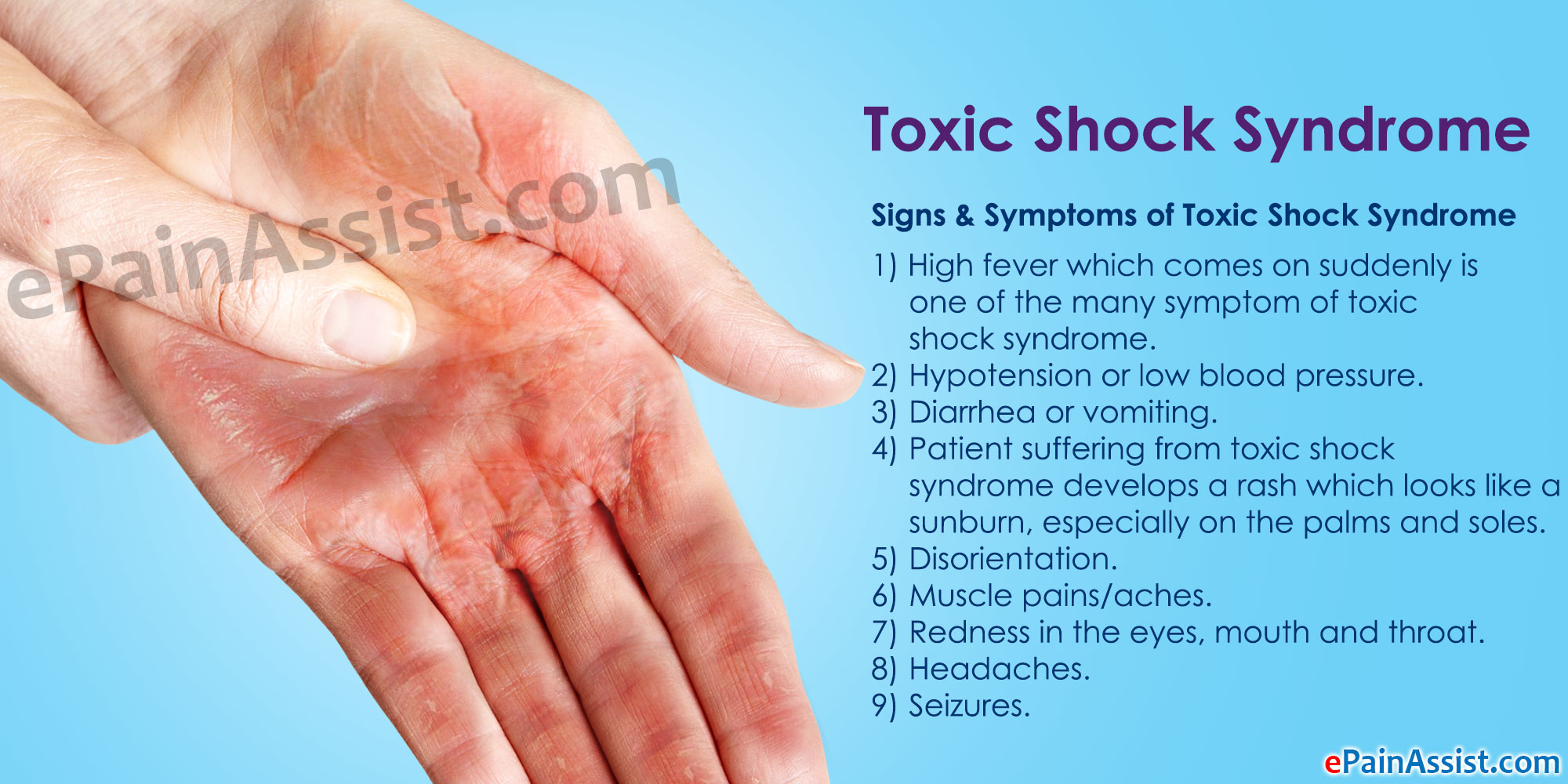 - Patient suffering from toxic shock syndrome develops a rash which looks like a sunburn, especially on the palms and soles.