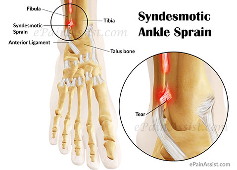 A Syndesmotic Sprain or Syndesmotic Ankle Sprain is a condition where there is injury or damage to the syndesmotic ligaments which hold the ankle, tibia and fibula together. As the injury occurs in the upper part of the ankle, it is called as syndesmotic sprain or syndesmotic ankle sprain. The anterior tibiofibular ligament is the commonly injured ligament. This injury can also occur with fracture of tibia or fibula.