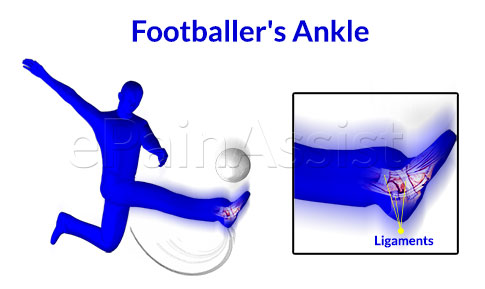 Footballer’s ankle is a condition where the ligaments of the ankle or tendons of the ankle get pinched or compressed between the talus and the tibia. This causes pain, swelling, and inflammation. The cause can be an injury where the ankle has been overstretched or overflexed.