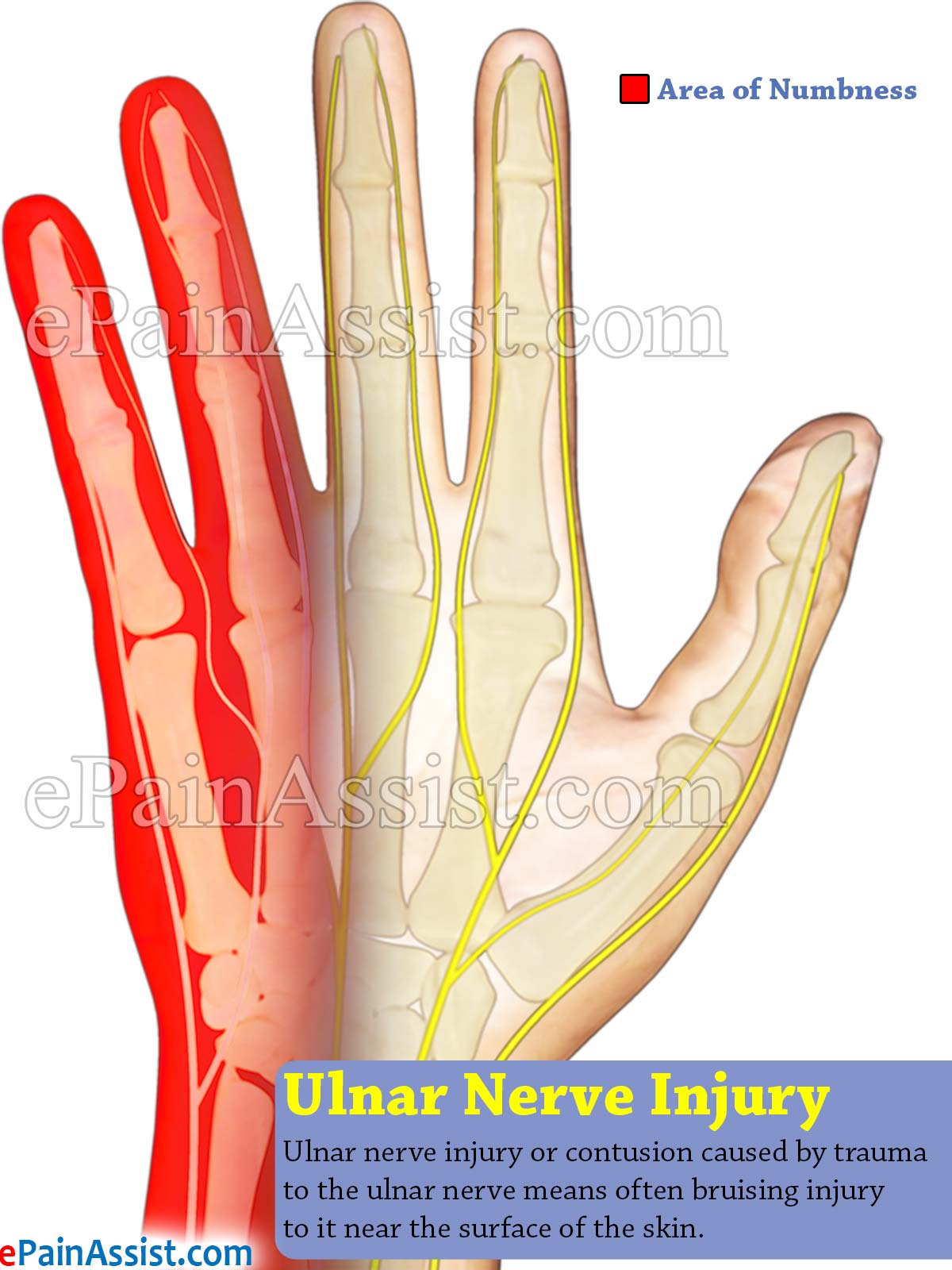 The ulnar nerve travels down the internal side of the elbow. Ulnar nerve injury or contusion caused by trauma to the ulnar nerve means often bruising injury to it near the surface of the skin. Ulnar nerve injury causes the capillaries surrounding ulnar nerve to rupture and bleed. The blood from the ruptured capillaries infiltrates the nerve. If there is direct injury to the ulnar nerve, then it results in temporary or permanent damage of the nerve. Symptoms of ulnar nerve injury are similar to ulnar nerve neuropathy. Common symptoms of ulnar nerve injury are pain, weakness in the hand, and loss of feeling, commonly in the fourth and fifth fingers.