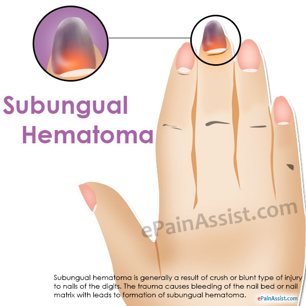 Subungual hematoma is the gathering of blood under the fingernail. Subungual hematoma is generally a result of crush or blunt type of injury to nails of the digits. The trauma causes bleeding of the nail bed or nail matrix with leads to formation of subungual hematoma. A subungual hematoma may lead to symptoms like throbbing and intense pain when the blood gets collected below the nail. Subungual hematoma(1) is not a serious condition unless there is involvement of broken bones or the nail bed is damaged along with the surrounding tissues.