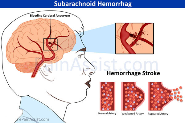 Subarachnoid Brain Hemorrhage can occur due to direct impact to the head resulting in a head injury such as getting hit on the head by a hard object, car accidents or falling and landing on the head. It can occur spontaneously due to a ruptured cerebral aneurysm. This occurs in individuals who have high blood pressure and are smokers between the ages of 20 to 60. Women are slightly more affected than men.