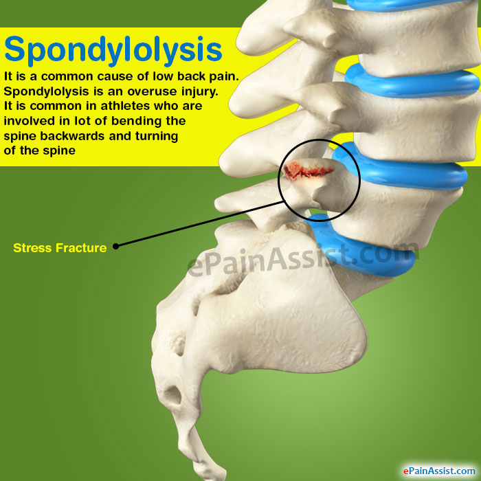 Spondylolysis is a deficiency or defect in the vertebral joints of the spinal column. This defect can result in minor stress fractures or breaks in the vertebrae that causes weakening of the bones. Due to this, one vertebra slips out of its place on top of other (spondylolisthesis). Spondylolysis is a common cause of low back pain. Spondylolysis is an overuse injury. It is common in athletes who are involved in lot of bending the spine backwards and turning of the spine.
