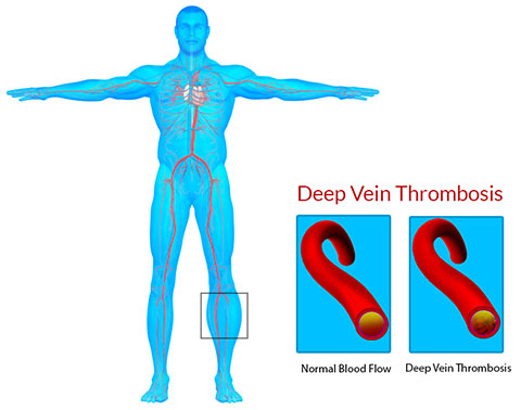 Deep Vein Thrombosis is the presence of blood clot or a thrombus in a vein. It commonly occurs in the calf muscle area, especially after surgery and long-haul flights. Individuals who are overweight, over the age of 50 or those who have poor blood circulation are at high risk for developing DVT. This condition becomes life threatening if a piece of the clot breaks off and enters into blood circulation towards heart, lungs or brain. It may result in a heart attack, stroke, or pulmonary embolism.