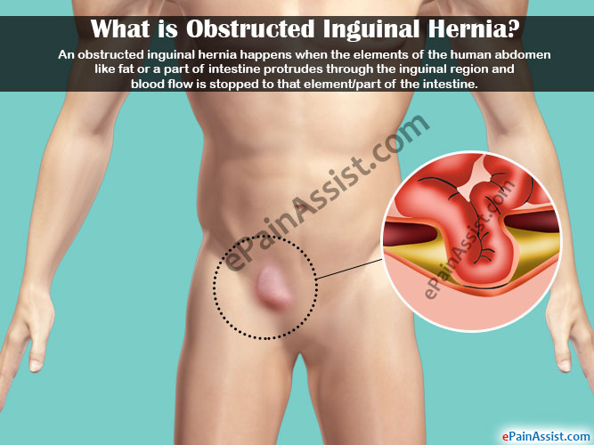 - An obstructed inguinal hernia happens when the elements of the human abdomen like fat or a part of intestine protrudes through the inguinal region and blood flow is stopped to that element/part of the intestine.