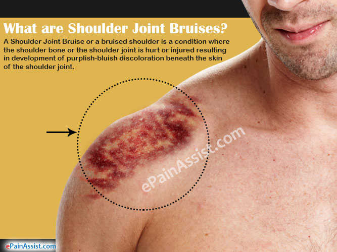 A Shoulder Joint Bruise or a bruised shoulder is a condition where the shoulder bone or the shoulder joint is hurt or injured resulting in development of purplish-bluish discoloration beneath the skin of the shoulder joint. Shoulder Joint Bruises are a common complaint among athletes and people who are involved in heavy physical activities, such as lifting weight or lifting heavy boxes etc. subcutaneous shoulder bruises usually do not require treatment and heal on their own. It can take up to four to six weeks for healing of shoulder joint bruises which are periosteal in nature.