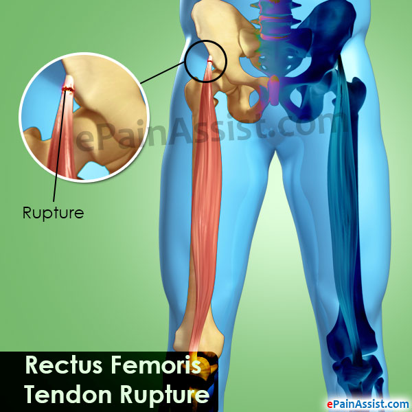 The rectus femoris muscle is one of the large quadriceps muscles which travel down the middle of the anterior region of the thigh. Rectus femoris muscle is a biaxial muscle, which means that it crosses two joints, namely the hip and knee joint. This muscle helps in straightening the knee or lifting up the knee. So, when a person does some explosive activity, such as jumping or kicking, then large forces are passed through the muscle putting stress on it. The rectus femoris tendon can rupture or become inflamed in upper region close to where it originates at the hip. The primary cause of rectus femoris tendon rupture is overuse through movements, such as kicking or other explosive movements, such as seen in sprint starts.